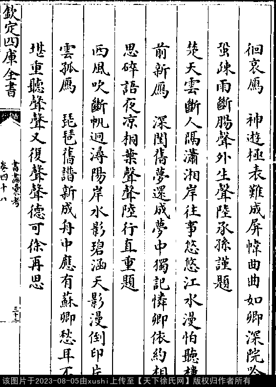 清平乐 题碧梧苍石图 元 · 徐再思 西风吹断。 帆迥浔阳岸。 水影碧涵天影漫。 倒印片云孤雁。 琵琶旧谱新成。 舟中应有苏卿。 愁耳不堪重听,声声又复声声。 按:珊瑚网名画题跋卷八 出处:《書畫彙考-清-卞永譽》卷四十八(第 32a - 32b 頁)