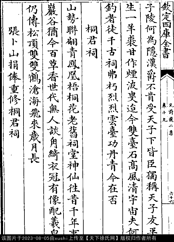 张卜山捐俸重修桐君祠 元 · 徐舫 七言律诗 押支韵 先生远有烟霞趣,镌玉捐金隐者祠。 瑶草久荒云一片,碧桐仍见凤双枝。 芙蓉日静文书暇,杖履春来啸咏迟。 他日幽期何处好,寒松花发鹤归时。 出处: 《元詩選-清-顧嗣立》元詩選 二集卷十九(第 67a - 67b 頁)