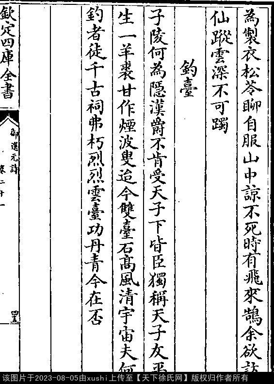 钓台 元 · 徐舫 押词韵第十二部 子陵何为隐,汉爵不肯受。 天子下皆臣,独称天子友。 平生一羊裘,甘作烟波叟。 迨今双台石,高风清宇宙。 夫何钓者徒,千古祠弗朽。 烈烈云台功,丹青今在否? 出处: 《御選宋金元明四朝詩-清-聖祖玄燁》御選宋金元明四朝詩 御選元詩卷二十一(第 45a - 45b 頁)
