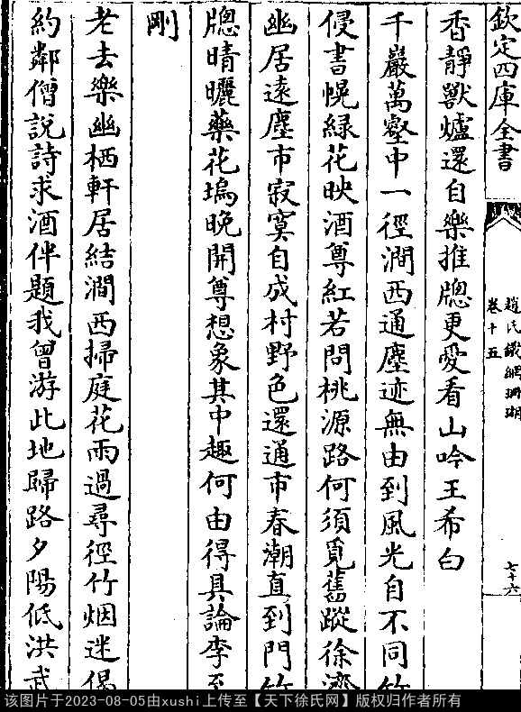 题秀野轩图 明 · 徐济 五言律诗 押词韵第一部 出处:明诗纪事 甲签·卷二十七 千岩万壑中,一径涧西通。 尘迹无由到,风光自不同。 竹侵书幌绿,花映酒樽红。 若问桃源路,无须觅旧踪。 出处: 《趙氏鐵綱珊瑚-明-朱存理》卷十五(第 76b - 77a 頁)