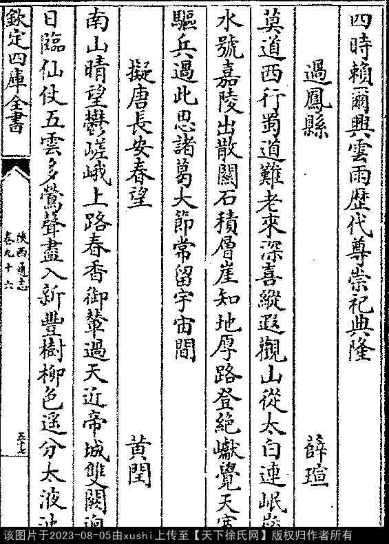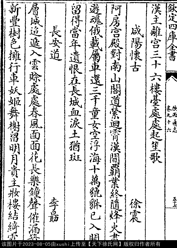 咸阳怀古 明 · 徐震 七言律诗 押删韵 阿房宫殿对南山,阁道萦回霄汉间。 伯业终随烽火尽,游魂俄载属车还。 三千童女空浮海,十万貔貅已入关。 留得当年遗恨在,长城血泪土犹斑。 出处: 《陝西通志-清-劉於義》卷九十六(第 57b - 58a 頁)