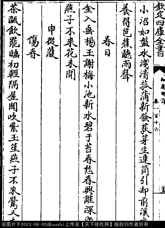 即事 明 · 徐居正 七言绝句 押庚韵 小沼如盘水浅清,菰蒲新发荻芽生。 连筒引却前溪水,养得芭蕉听雨声。 出处: 《御選宋金元明四朝詩-清-聖祖玄燁》御選宋金元明四朝詩 御選明詩卷一百十六(第 25b - 26a 頁)
