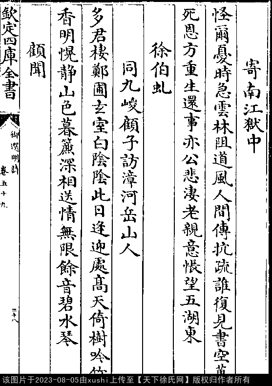 寄南江狱中 明 · 徐献忠 五言律诗 押东韵 出处:御选明诗卷五十九 怪尔忧时急,云林阻道风。 人间传抗疏,谁复见书空。 万死恩方重,生还事亦公。 悲凄老亲意,怅望五湖东。 出处: 《御選宋金元明四朝詩-清-聖祖玄燁》御選宋金元明四朝詩 御選明詩卷五十九(第 28a - 28b 頁)