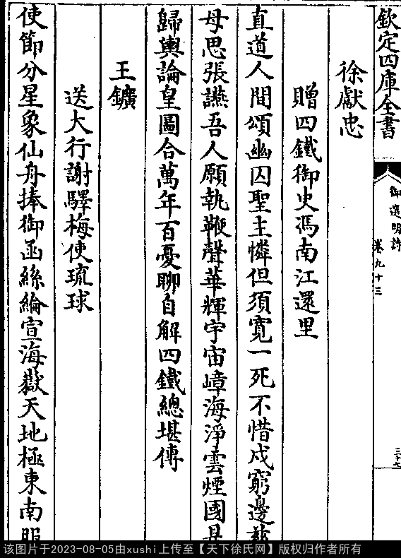 赠四铁御史冯南江还里 明 · 徐献忠 五言排律 押先韵 出处:御选明诗卷九十三 直道人间颂,幽囚圣主怜。 但须宽一死,不惜戍穷边。 慈母思张宴,吾人愿执鞭。 声华辉宇宙,嶂海净云烟。 国是归舆论,皇图合万年。 百忧聊自解,四铁总堪传。 出处: 《御選宋金元明四朝詩-清-聖祖玄燁》御選宋金元明四朝詩 御選明詩卷九十三(第 37b - 38a 頁)