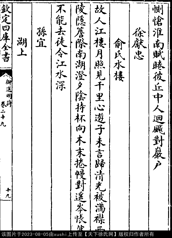 俞氏水楼 明 · 徐献忠 押侵韵 出处:御选明诗卷二十九 故人江楼月,照见千里心。 游子未言归,清光被满襟。 西陵隐檐际,南湖澄夕阴。 持杯向木末,捲幔对遥岑。 怅然不能去,徒令江水深。 出处: 《御選宋金元明四朝詩-清-聖祖玄燁》御選宋金元明四朝詩 御選明詩卷二十九(第 19a - 19b 頁)