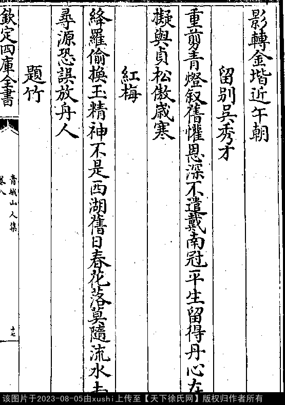 琼岛(清温汝能《粤东诗海》卷九八作释定祖诗) 明 · 徐汝栻 七言绝句 押灰韵 松关风掩白云开,春暖壶天万象回。 花落莫随流水去,恐教渔父问津来(以上清康熙《禺峡山志》卷三)。 出处: 《青城山人集-明-王燧》卷八(第 17a - 17b 頁)