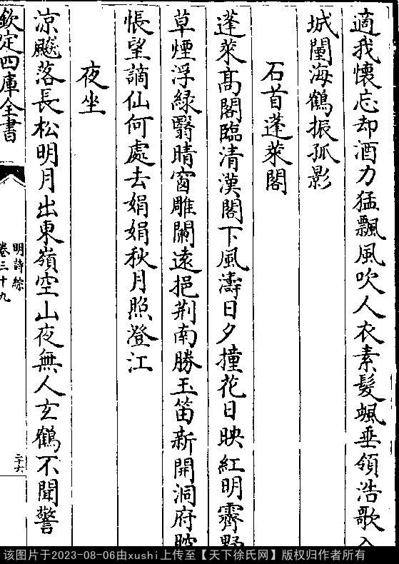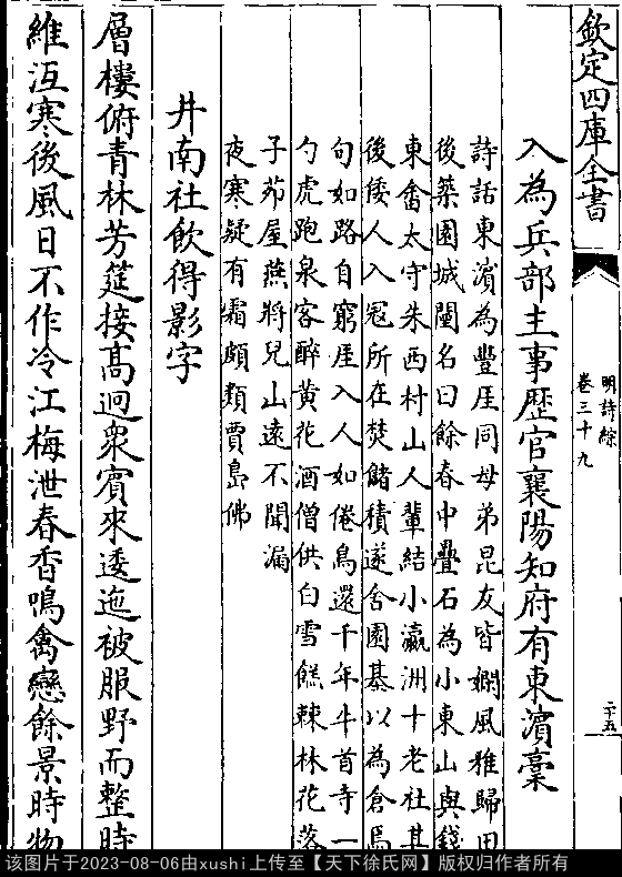 井南社饮得影字 明 · 徐咸 押词韵第十一部 出处:御选明诗卷二十五 层楼俯青林,芳筵接高迥。 众宾来逶迤,被服野而整。 时维冱寒候,风日不作冷。 江梅泄春香,鸣禽恋馀景。 时物适我怀,忘却酒力猛。 飘风吹人衣,素发飒垂领。 浩歌入城闉,海鹤振孤影。 出处: 《明詩綜-清-朱彝尊》卷三十九(第 25b - 26b 頁)