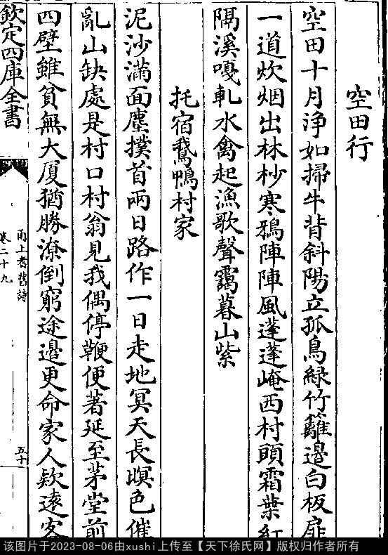 托宿鹅鸭村家 明 · 徐阳辉 出处:甬上耆旧诗卷二十九 泥沙满面尘扑首,两日路作一日走。 地冥天长暝色催,乱山缺处是村口。 村翁见我偶停鞭,便著延至茅堂前。 四壁虽贫无大厦,犹胜潦倒穷途边。 更命家人款远客,网得鲤鱼长一尺。 老瓦盆浮雪蚁香,折脚铛煮霜蟹赤。 敬客还恐扰客眠,教儿今夜莫打麦。 明发饭罢送出村,为言直北过竹墩。 沿江再觅便船渡,顷刻可到县西路。 出处: 《甬上耆舊詩-清-胡文學》卷二十九(第 50a - 51a 頁)