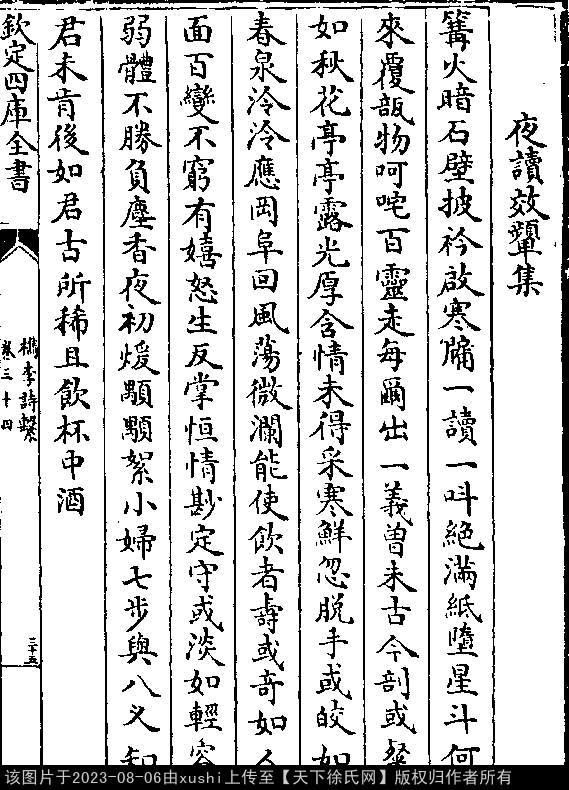 夜读效颦集 明 · 徐范 押有韵 出处:槜李诗系卷三十四 篝火暗石壁,披衿启寒牖。 一读一叫绝,满纸堕星斗。 何来覆瓿物,呵咤百灵走。 每尔出一义,曾未古今剖。 或粲如秋花,亭亭露光厚。 含情未得采,寒鲜忽脱手。 或皎如春泉,泠泠应冈阜。 回风荡微澜,能使饮者寿。 或奇如人面,百变不穷有。 嬉怒生反掌,恒情鲜定守。 或淡如轻容,弱体不胜负。 尘香夜初煖,颙颙絮小妇。 七步与八叉,知君未肯后。 如君古所稀,且饮杯中酒。 出处: 《檇李詩繫-清-沈季友》卷三十四(第 35a - 35b 頁)