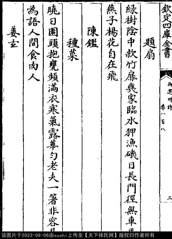 题扇 明 · 徐充 七言绝句 押微韵 出处:御选明诗卷一百八 绿树阴中款竹扉,几家临水狎渔矶。 日长门径无车马,燕子杨花自在飞。 出处: 《御選宋金元明四朝詩-清-聖祖玄燁》御選宋金元明四朝詩 御選明詩卷一百八(第 3b - 4a 頁)