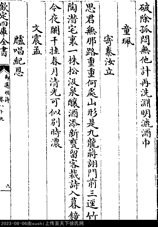 病起 明 · 徐笃 七言律诗 押真韵 出处:御选明诗卷八十九 病起茅斋已浃旬,案书狼藉任埋尘。 十年事业空双剑,半世交游复几人。 苔井细阴桐叶坠,荆篱秋雨豆花新。 破除孤闷无他计,再洗渊明漉酒巾。 出处: 《御選宋金元明四朝詩-清-聖祖玄燁》御選宋金元明四朝詩 御選明詩卷八十九(第 5b - 6b 頁)
