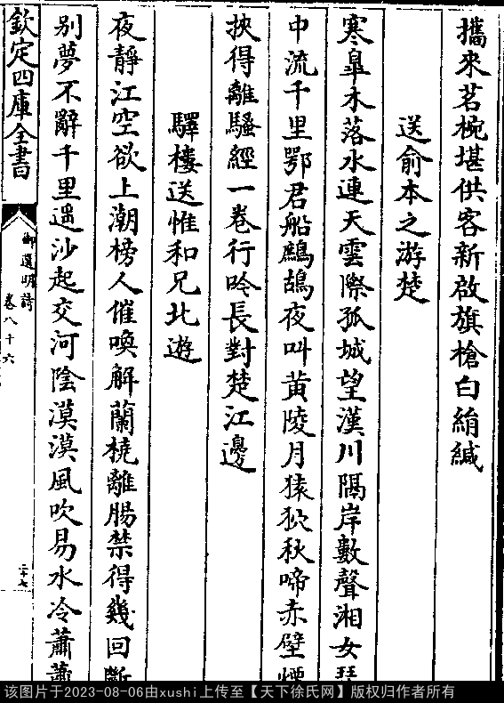 驿楼送惟和兄北游 明 · 徐㶿 七言律诗 押萧韵 出处:御选明诗卷八十六 夜静江空欲上潮,榜人催唤解兰桡。 离肠禁得几回断,别梦不辞千里遥。 沙起交河阴漠漠,风吹易水冷萧萧。 关山迢递何时尽,此是他乡第一宵。 出处: 《御選宋金元明四朝詩-清-聖祖玄燁》御選宋金元明四朝詩 御選明詩卷八十六(第 27a - 28a 頁)