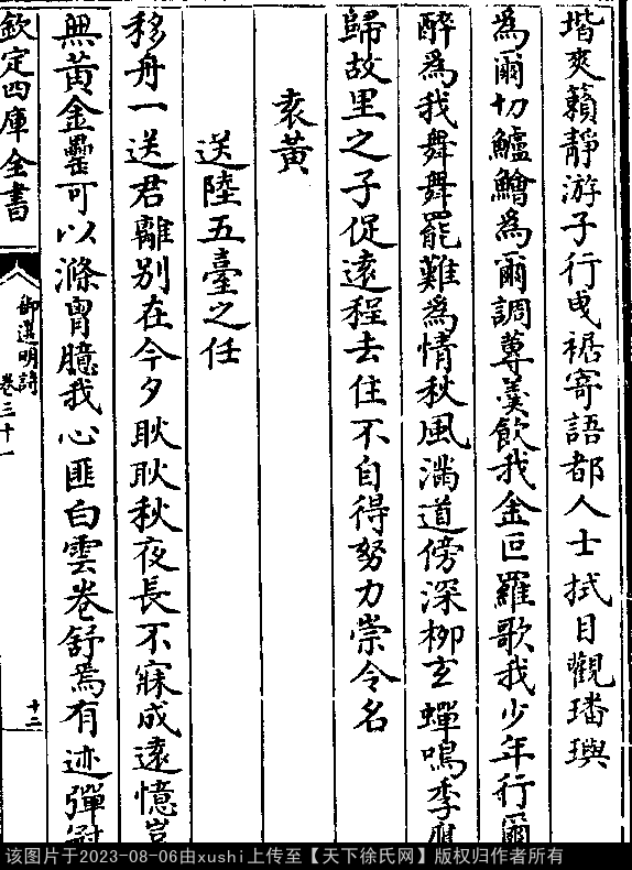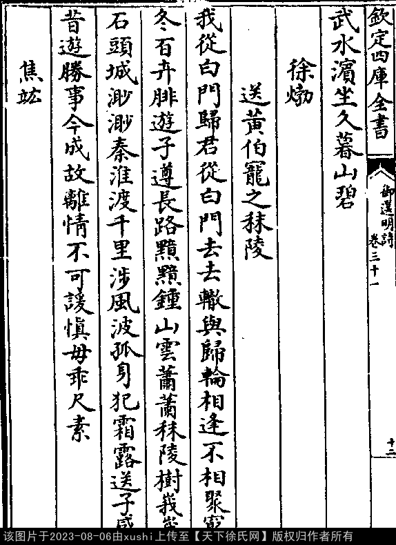 送黄伯宠之秣陵 明 · 徐㶿 押词韵第四部 出处:御选明诗卷三十一 我从白门归,君从白门去。 去辙与归轮,相逢不相聚。 穷冬百卉腓,游子遵长路。 黯黯钟山云,萧萧秣陵树。 峨峨石头城,渺渺秦淮渡。 千里涉风波,孤身犯霜露。 送子感昔游,胜事今成故。 离情不可谖,慎毋乖尺素。 出处: 《御選宋金元明四朝詩-清-聖祖玄燁》御選宋金元明四朝詩 御選明詩卷三十一(第 12b - 13a 頁)