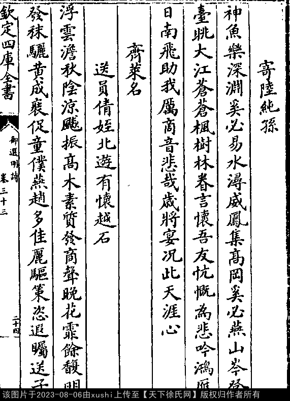 寄陆纯孙 明 · 徐应雷 押侵韵 出处:御选明诗卷三十三 神鱼乐深渊,奚必易水浔。 威凤集高冈,奚必燕山岑。 登台眺大江,苍苍枫树林。 眷言怀吾友,忼慨为悲吟。 鸿雁日南飞,助我厉商音。 悲哉岁将宴,况此天涯心。 出处: 《御選宋金元明四朝詩-清-聖祖玄燁》御選宋金元明四朝詩 御選明詩卷三十三(第 24a - 24b 頁)