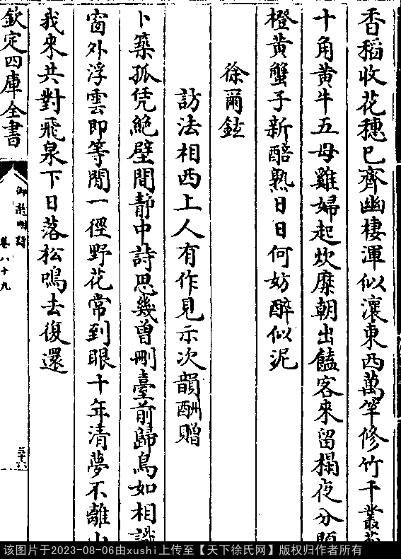 陆瞿弥俞彦直张蓝田冯素生醉月竹西轩怀唐尹季张子念 明 · 徐尔铉 七言律诗 押尤韵 出处:御选明诗卷八十九 閒中宴笑可相求,水上亭虚恰胜舟。 入座月争先后得,侵杯花竞浅深浮。 从来酒国难为夜,莫把欢场易送秋。 醉倒胡床人莫笑,霜天几作异乡愁。 出处: 《御選宋金元明四朝詩-清-聖祖玄燁》御選宋金元明四朝詩 御選明詩卷八十九(第 36b - 37a 頁)