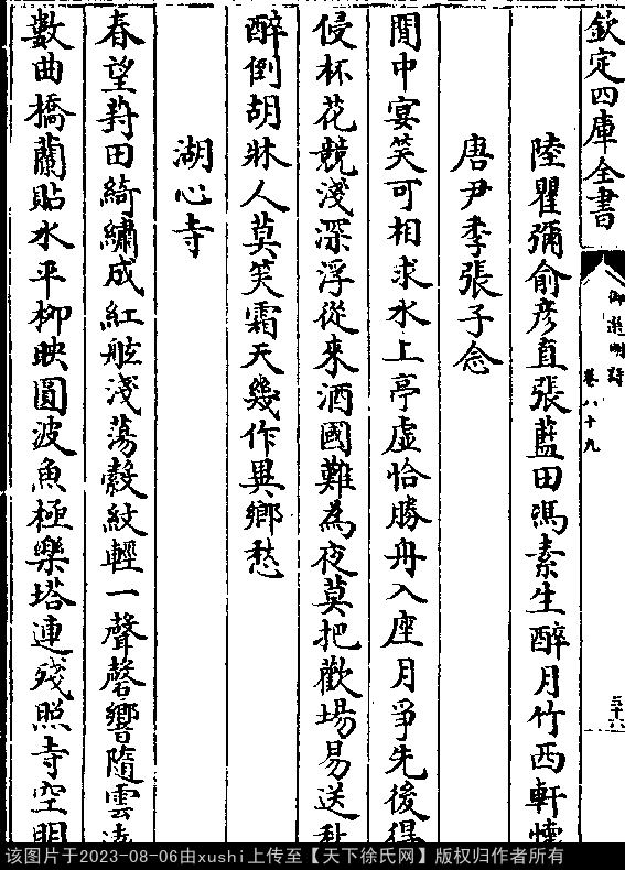 湖心寺 明 · 徐尔铉 七言律诗 押庚韵 出处:御选明诗卷八十九 春望葑田绮绣成,红舷浅荡縠纹轻。 一声磬响随云远,数曲桥兰贴水平。 柳映圆波鱼极乐,塔连残照寺空明。 天然独拥诸峰立,酌茗寒潭韵更清。 出处: 《御選宋金元明四朝詩-清-聖祖玄燁》御選宋金元明四朝詩 御選明詩卷八十九(第 36b - 37b 頁)