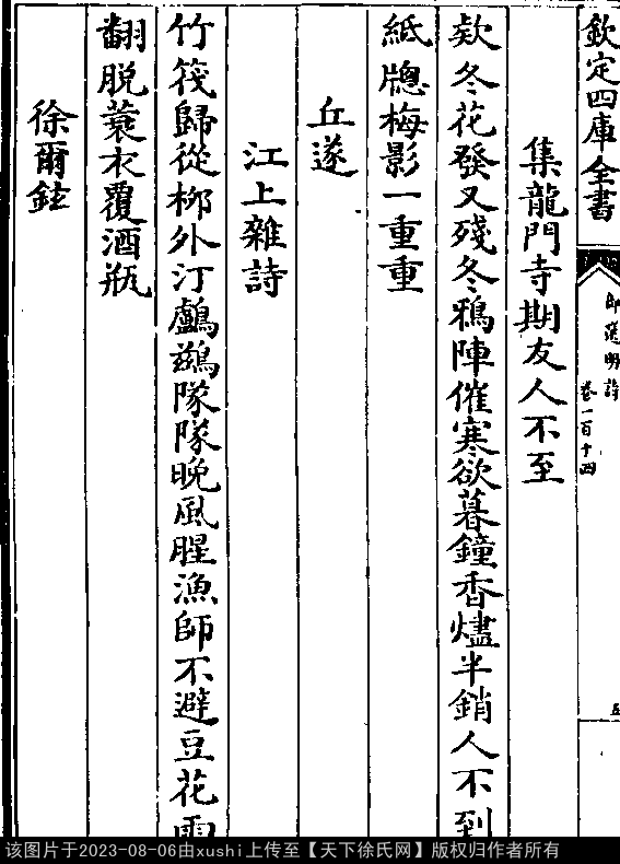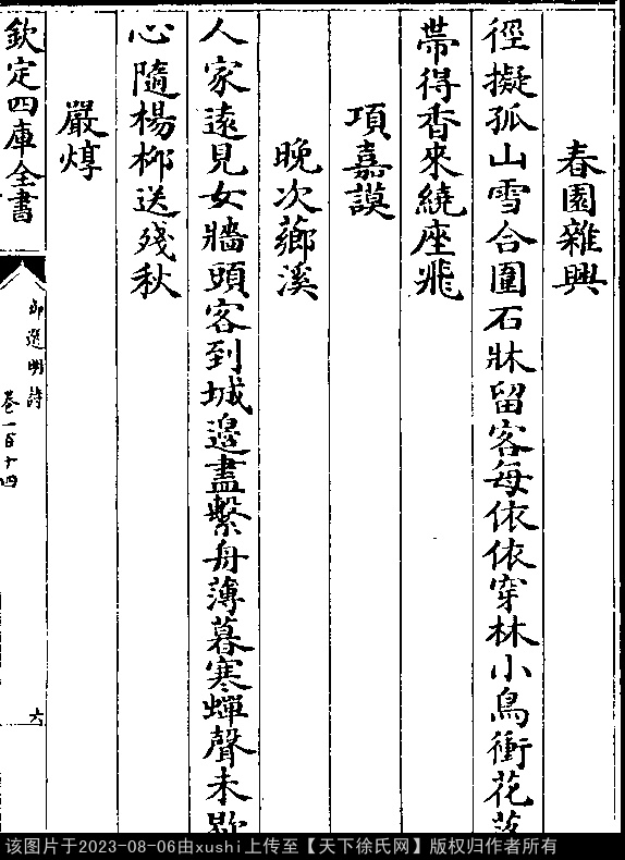 春园杂兴 明 · 徐尔铉 七言绝句 押微韵 出处:御选明诗卷一百十四 径拟孤山雪合围,石床留客每依依。 穿林小鸟冲花落,带得香来绕座飞。 出处: 《御選宋金元明四朝詩-清-聖祖玄燁》御選宋金元明四朝詩 御選明詩卷一百十四(第 6a - 6b 頁)