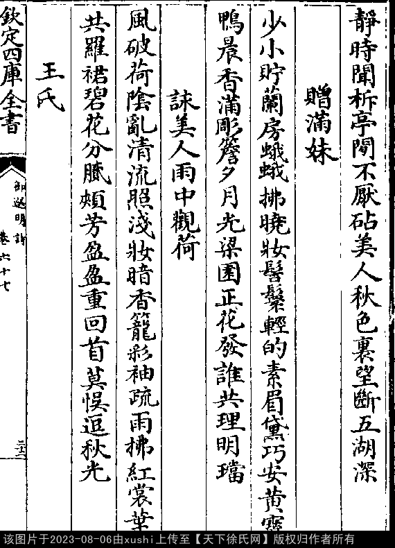 赠满妹 明 · 徐小淑 五言律诗 押阳韵 出处:御选明诗卷六十七 少小贮兰房,蛾蛾拂晓妆。 髻鬟轻的素,眉黛巧安黄。 宝鸭晨香满,彫檐夕月光。 梁园正花发,谁共理明珰。 出处: 《御選宋金元明四朝詩-清-聖祖玄燁》御選宋金元明四朝詩 御選明詩卷六十七(第 22a - 22b 頁)