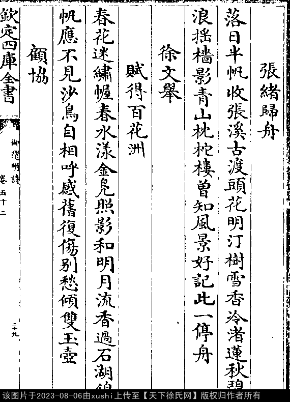 赋得百花洲 明 · 徐文举 五言律诗 押虞韵 出处:御选明诗卷五十二 春花迷绣幄,春水漾金凫。 照影和明月,流香过石湖。 锦帆应不见,沙鸟自相呼。 感旧复伤别,愁倾双玉壶。 出处: 《御選宋金元明四朝詩-清-聖祖玄燁》御選宋金元明四朝詩 御選明詩卷五十二(第 29a - 29b 頁)