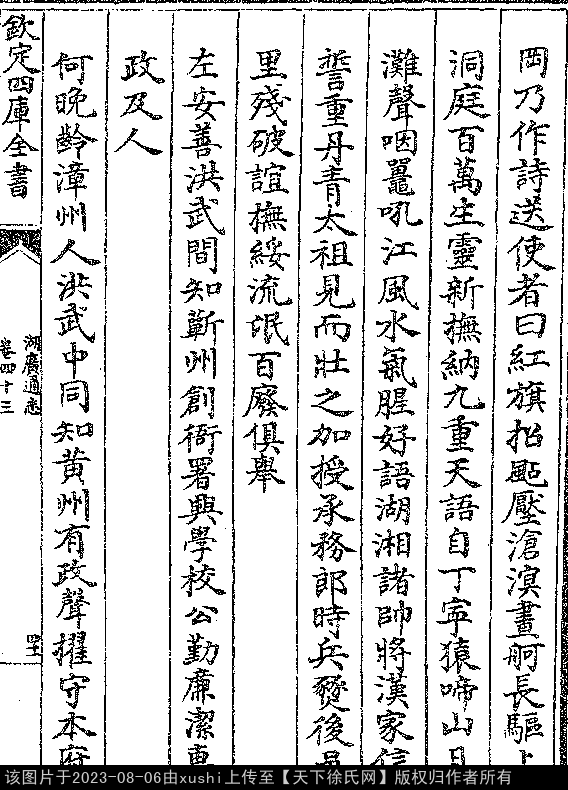 受命知黄冈县事作诗送使者 明 · 徐冥 七言律诗 押青韵 出处:古今图书集成 红旗招飐压沧溟,画舸长驱上洞庭。 百里生灵新抚纳,九重天语自叮咛。 猿啼山月滩声咽,鼍吼江风水气腥。 好语湖湘诸将帅,汉家信誓重丹青。 按:整理自《古今图书集成》黄州府部 出处: 《湖廣通志-清-邁柱》卷四十三(第 41a - 41b 頁)
