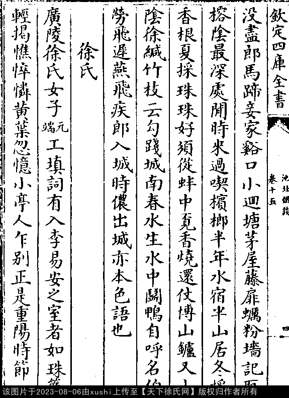 南乡子 明 · 徐元端 押词韵第三部 独坐数归期,花影重重日影低。 无计徘徊思好句,迟迟,除却春愁没个题。 闲倚画楼西,芳草青青失旧堤。 犹记当时人去处,依依,红杏花边一酒旗。 出处: 《池北偶談-清-王士禛》卷十五(第 5a - 5b 頁)