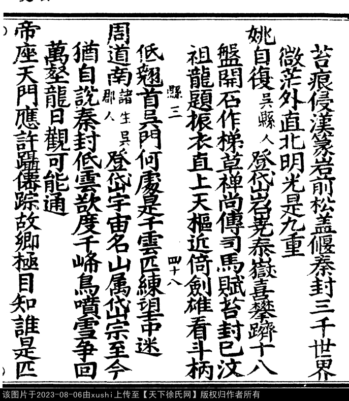 再登岱 明 · 徐守仁 七言律诗 押冬韵 出处:古今图书集成 两度探奇谒岱宗,山增灵秀拥芙蓉。 穿云曾出天门路,望海还凌日观峰。 碑上苔痕侵汉篆,岩前松盖偃秦封。 三千世界微茫外,直北光华是九重。 出处: 《岱史--查志隆》卷十七(第 59b - 60b 頁)