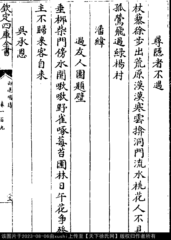 寻隐者不遇 明 · 徐永宁㭿 七言绝句 押元韵 杖藜徐步出荒原,漠漠寒云掩洞门。 流水桃花人不见,孤莺飞过绿杨村。 出处: 《御選宋金元明四朝詩-清-聖祖玄燁》御選宋金元明四朝詩 御選明詩卷一百九(第 22a - 22b 頁)