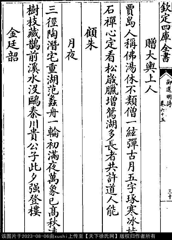 赠大舆上人 明 · 徐远 五言律诗 押蒸韵 出处:御选明诗卷六十五 贾岛人称佛,汤休不类僧。 一弦弹古月,五字琢寒冰。 指石禅心定,看松岁腊增。 鸳湖多长者,共许道人能。 出处: 《御選宋金元明四朝詩-清-聖祖玄燁》御選宋金元明四朝詩 御選明詩卷六十五(第 30b - 31a 頁)