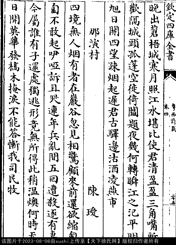 泊府门驿怀姚仲和却寄 明 · 徐棻 押纸韵 出处:粤西诗载卷四 晚出苍梧城,寒月照江水。 堪比使君清,盈盈三角嘴。 所欢隔城头,孤篷空徙倚。 阄题夜几何,转瞬江之汜。 平明旭日开,四望疏烟起。 迟君古驿边,沽酒凌燕市。 出处: 《粵西詩載-清-汪森》卷四(第 25b - 26a 頁)