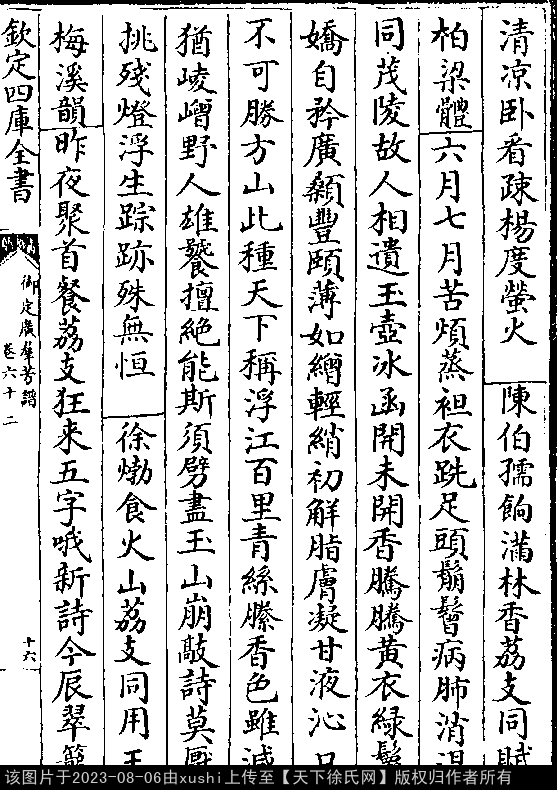 食火山荔支同用王梅溪韵 明 · 徐 出处:古今图书集成 昨夜聚首餐荔支,狂来五字哦新诗。 今辰翠笼又擎到,别有一种尤珍奇。 根株艺植同一土,易熟离离满园圃。 本支已识分广南,不待按图翻旧谱。 异名嘉实虽满山,定让此品来争先。 尝新既喜早一月,冰盘擘啖流馋涎。 乍食无多腹不果,三百青铜沽百颗。 相期同到凤凰冈,天柱梢头赤如火。 按:整理自《古今图书集成》荔枝部 出处: 《御定佩文齋廣羣芳譜-清-汪灝》御定佩文齋廣群芳譜 卷六十二(第 16a - 17a 頁)