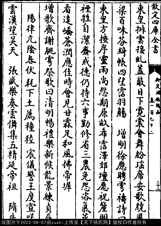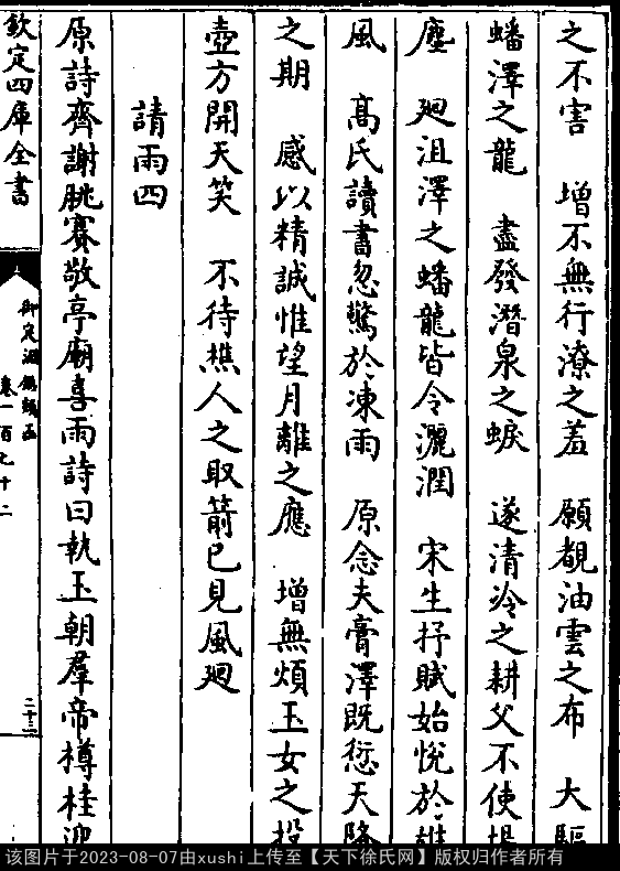 雩祷诗 明 · 徐应聘 五言排律 押支韵 出处:古今图书集成 东皇方按序,灵雨尚愆期。 原亩希沾泽,郊坛愿祝釐。 明禋牲自洁,斋戒德仍持。 六事勤修省,三农免怨咨。 气蒸看远峤,苍润应佳时。 会见甘霖足,和风拂帝墀。 按:整理自《古今图书集成》雩祀部 出处: 《御定淵鑑類函-清-張英》御定淵鑑類函 卷一百七十二(第 23b - 24a 頁)