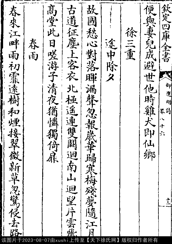 春雨 明 · 徐三重 七言律诗 押微韵 出处:御选明诗卷八十六 春来江畔雨初霏,远树和烟接翠微。 新草忽惊侵去路,暗尘无复到征衣。 山围故国浮云暮,路入寒塘杨柳稀。 愁对梅花一回首,漫依归雁却西飞。 出处: 《御選宋金元明四朝詩-清-聖祖玄燁》御選宋金元明四朝詩 御選明詩卷八十六(第 13b - 14b 頁)