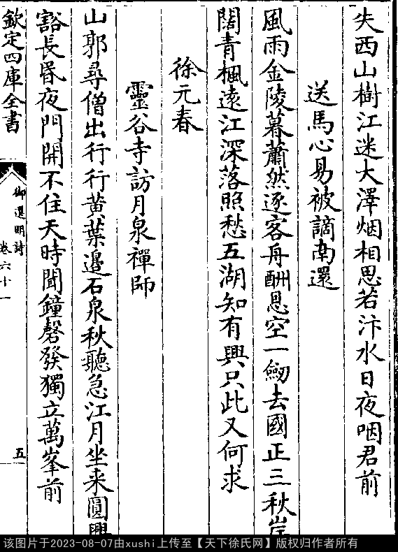 灵谷寺访月泉禅师 明 · 徐元春(正夫) 五言律诗 押先韵 出处:御选明诗卷六十一 山郭寻僧出,行行黄叶边。 石泉秋听急,江月坐来圆。 兴豁长昏夜,门开不住天。 时闻钟磬发,独立万峰前。 出处: 《御選宋金元明四朝詩-清-聖祖玄燁》御選宋金元明四朝詩 御選明詩卷六十一(第 5a - 5b 頁)