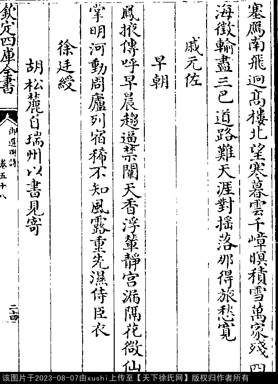 胡松麓自瑞州以书见寄 明 · 徐廷绶 五言律诗 押先韵 出处:御选明诗卷五十八 搔首西风里,怀君思惘然。 江湖千里隔,云树寸心悬。 客泪随猿落,乡书有雁传。 惟应今夜月,相对共遥天。 出处: 《御選宋金元明四朝詩-清-聖祖玄燁》御選宋金元明四朝詩 御選明詩卷五十八(第 24b - 25a 頁)