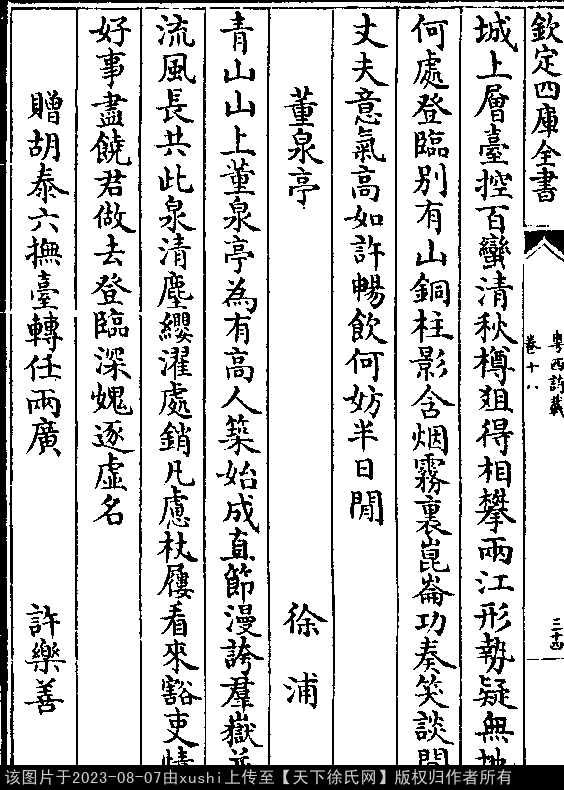 董泉亭 明 · 徐浦 七言律诗 押庚韵 出处:粤西诗载卷十八 青山山上董泉亭,为有高人筑始成。 直节漫誇群岳并,流风长共此泉清。 尘缨濯处销凡虑,杖屦看来豁吏情。 好事尽饶君做去,登临深愧逐虚名。 出处: 《粵西詩載-清-汪森》卷十八(第 34b - 35a 頁)