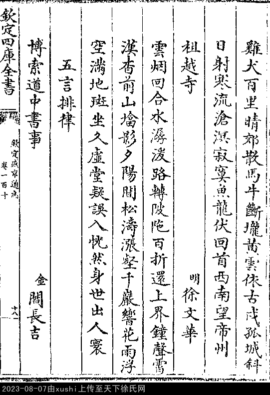 游千山祖越寺 明 · 徐文华 七言律诗 押删韵 出处:古今图书集成 堂皇回合水潺湲,路转坡岮百折还。 上界钟声霄汉杳,前山塔影夕阳閒。 松涛涨壑千岩响,花雨浮空满地斑。 坐久虚堂疑误入,恍然身世出人间。 按:整理自《古今图书集成》千山部 出处: 《欽定盛京通志-清-阿桂》欽定盛京通志 卷一百十(第 19a - 19b 頁)