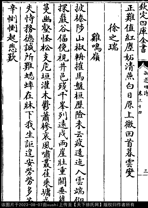 鸡鸣岭 明末清初 · 徐之瑞 押词韵第七部 出处:御选明诗卷三十四 披榛陟山椒,辀摧马盘桓。 历险未云疲,逶迤入云端。 仰探岩谷偪,俛视井邑残。 千峰列远戍,两崖壮重关。 垂萝蔓幽壑,怪松支危垣。 灌木郁萧椮,哀风啸丛雈。 乘墉或失恃,务德诚所难。 蟋蟀在床下,我生讵遑安。 劳劳多苦辛,恻恻起悲叹。 出处: 《御選宋金元明四朝詩-清-聖祖玄燁》御選宋金元明四朝詩 御選明詩卷三十四(第 3b - 4a 頁)