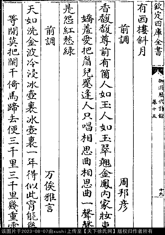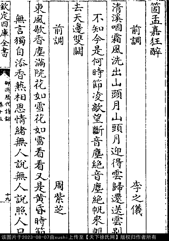 少年游 邓悦万席上有赠 清 · 徐燮 押词韵第十一部 出处:东皋诗馀卷之三 黄昏月色照閒庭。 罗袂夜凉轻。 烛剪金荷,香焚银鸭,促坐共调笙。 尊前有个人如玉,一笑自倾城。 两颊红舒,双眉绿淡,做尽许多情。 出处: 《御選歷代詩餘-清-聖祖玄燁》御選歷代詩餘 卷十五目録(第 26b - 27a 頁)