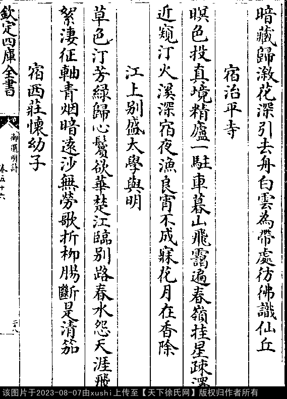 宿西庄怀幼于 明 · 徐繗 五言律诗 押歌韵 出郭风烟澹,林扉映绿波。 水回全作带,树古半悬罗。 月白鸿声切,花寒露气多。 佳游成独宿,良晤惜蹉跎。 出处: 《御選宋金元明四朝詩-清-聖祖玄燁》御選宋金元明四朝詩 御選明詩卷五十六(第 28b - 29a 頁)