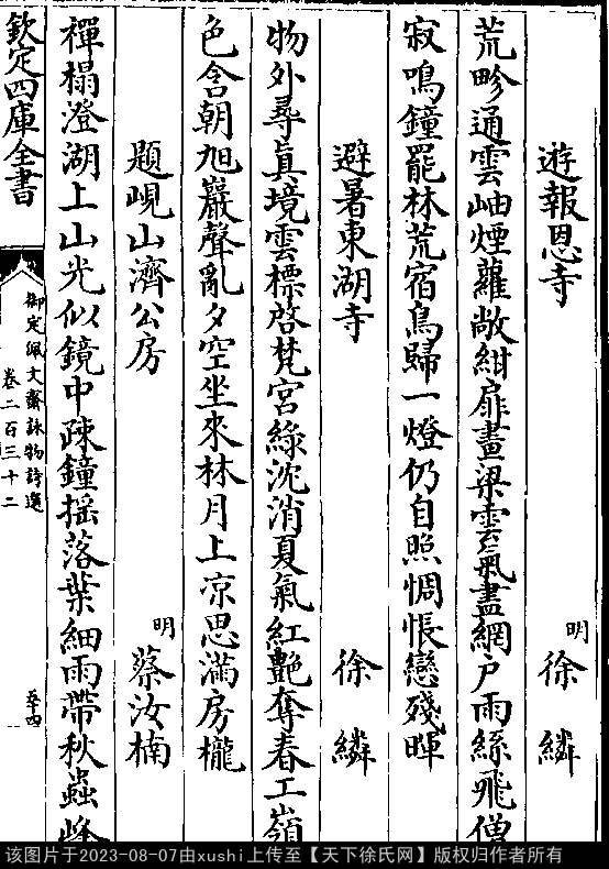 游报恩寺 明 · 徐繗 五言律诗 押微韵 荒畛通云岫,烟萝敞绀扉。 画梁云气尽,网户雨丝飞。 僧寂鸣钟罢,林荒宿鸟归。 一灯仍自照,惆怅恋残晖。 出处: 《御定佩文齋詠物詩選-清-張玉書》卷二百三十二(第 54a - 54b 頁)