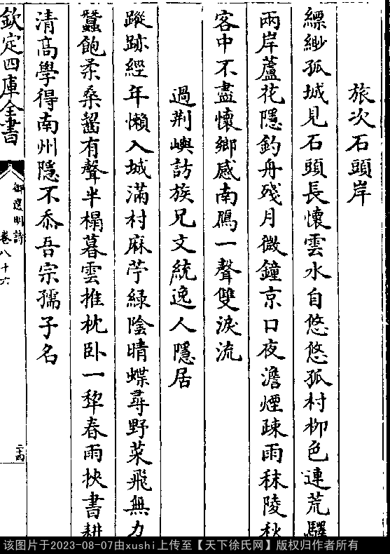 旅次石头岸 明 · 徐勃 七言律诗 押尤韵 缥缈孤城见石头,长淮云水自悠悠。 孤村柳色连荒驿,两岸芦花隐钓舟。 残月微钟京口夜,澹烟疏雨秣陵秋。 客中不尽怀乡感,南雁一声双泪流。 出处: 《御選宋金元明四朝詩-清-聖祖玄燁》御選宋金元明四朝詩 御選明詩卷八十六(第 24a - 24b 頁)