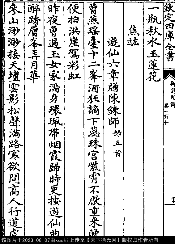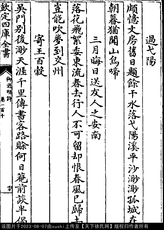 寄王百谷 明 · 徐勃 七言绝句 押麻韵 吴门别后渺天涯,千里传书客路赊。 何日庵前谈半偈,一瓶秋水玉莲花。 出处: 《御選宋金元明四朝詩-清-聖祖玄燁》御選宋金元明四朝詩 御選明詩卷一百十(第 40a - 41a 頁)