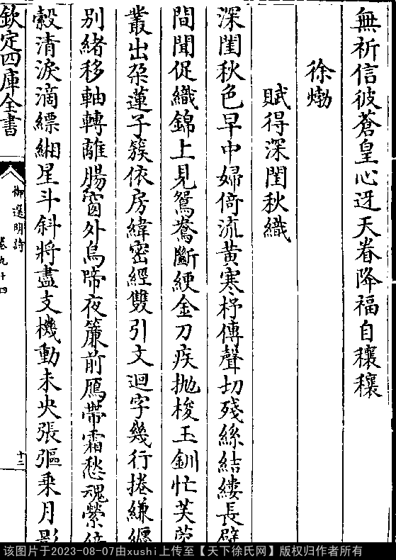 赋得深闺秋织 明 · 徐勃 五言排律 押阳韵 深闺秋色早,中妇倚流黄。 寒杼传声切,残丝结缕长。 壁间闻促织,锦上见鸳鸯。 断绠金刀疾,抛梭玉钏忙。 芙蓉丛出朵,莲子簇依房。 纬密经双引,文回字几行。 卷缣缠别绪,移轴转离肠。 窗外乌啼夜,帘前雁带霜。 愁魂萦绮谷,清泪滴缥缃。 星斗斜将尽,支机动未央。 张彄乘月影,完匹续灯光。 窦女思千里,天仙妒七襄。 莫辞闺力苦,边塞待衣裳。 出处: 《御選宋金元明四朝詩-清-聖祖玄燁》御選宋金元明四朝詩 御選明詩卷九十四(第 12a - 13a 頁)