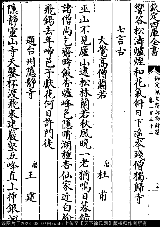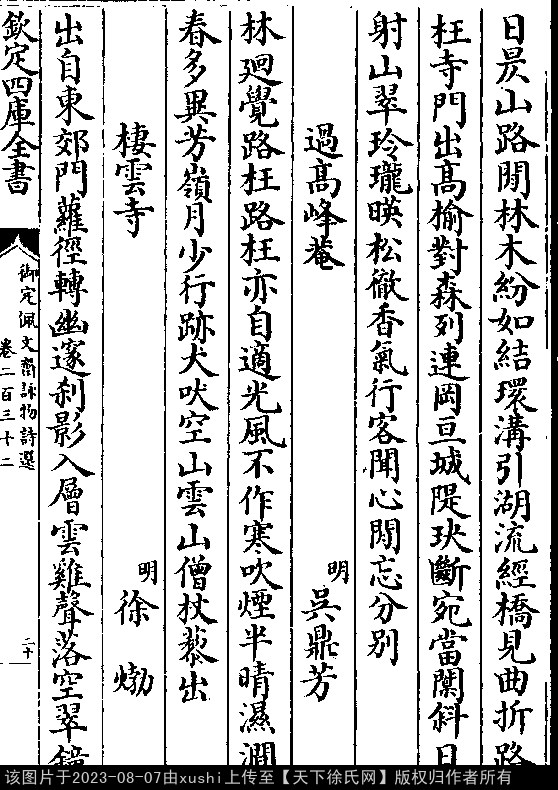 栖云寺 明 · 徐勃 押词韵第三部 出自东郊门,萝径转幽邃。 刹影入层云,鸡声落空翠。 钟响答松涛,垆烟和花气。 斜日下遥岑,残僧独归寺 出处: 《御定佩文齋詠物詩選-清-張玉書》卷二百三十二(第 20a - 21a 頁)