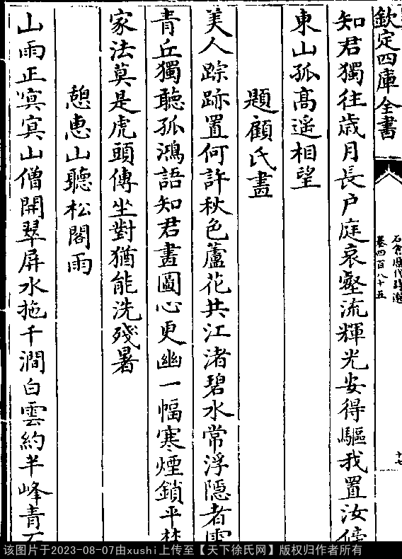 题顾氏画 明 · 徐问 押语韵 出处:石仓历代诗选卷四百八十五 美人踪迹置何许,秋色芦花共江渚。 碧水常浮隐者云,青丘独听孤鸿语。 知君画图心更幽,一幅寒烟锁平楚。 家法莫是虎头传,坐对犹能洗残暑。 出处: 《石倉歷代詩選-明-曹學佺》卷四百八十五(第 17b - 18a 頁)
