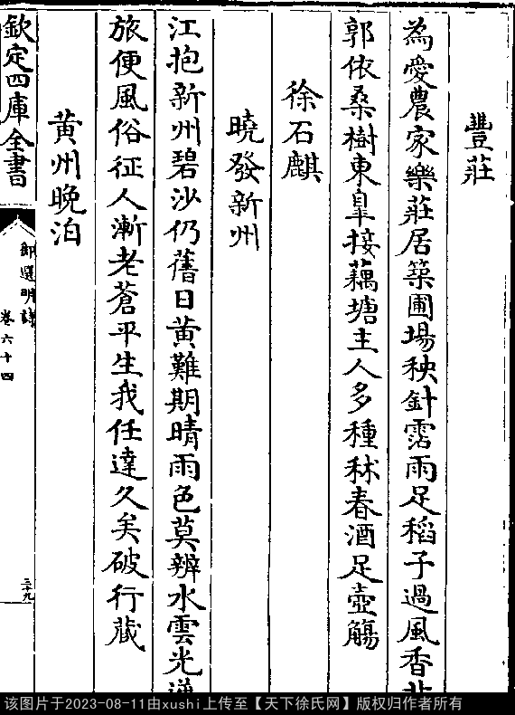 晓发新州 明末清初 · 徐石麒 五言律诗 押阳韵 出处:御选明诗卷六十四 江抱新州碧,沙仍旧日黄。 难期晴雨色,莫辨水云光。 逆旅便风俗,征人渐老苍。 平生我任达,久矣破行藏。 出处:《御選宋金元明四朝詩-清-聖祖玄燁》御選宋金元明四朝詩 御選明詩卷六十四(第 39a - 39b 頁)