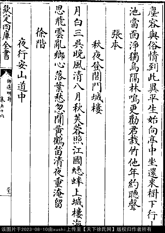 夜行安山道中 明 · 徐阶 五言律诗 押萧韵 木落境萧萧,残灯照寂寥。 病惊时日暮,愁厌客途遥。 急涧听逾响,荒村语不嚣。 月明如有意,深夜伴归桡。 出处: 《御選宋金元明四朝詩-清-聖祖玄燁》御選宋金元明四朝詩 御選明詩卷五十六(第 31b - 32a 頁)