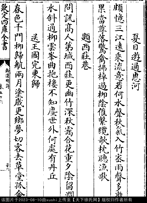 题西庄巷 明 · 徐阶 五言律诗 押尤韵 出处:御选明诗卷五十六 问讯高人第,城西庄更幽。 竹深秋霭合,花重夕阴留。 涧水斜通柳,云峰曲抱楼。 不知尘世外,何处有丹丘。 出处: 《御選宋金元明四朝詩-清-聖祖玄燁》御選宋金元明四朝詩 御選明詩卷五十六(第 32a - 32b 頁)