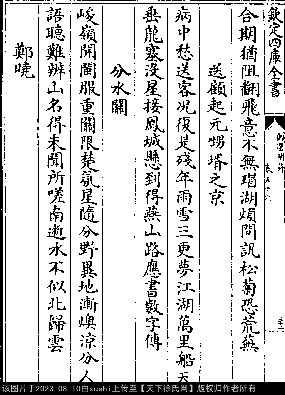 分水关 明 · 徐阶 五言律诗 押文韵 出处:御选明诗卷五十六 峻岭开闽服,重关限楚氛。 星随分野异,地渐燠凉分。 人语听难辨,山名得未闻。 所嗟南逝水,不似北归云。 出处: 《御選宋金元明四朝詩-清-聖祖玄燁》御選宋金元明四朝詩 御選明詩卷五十六(第 32b - 33a 頁)