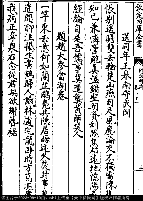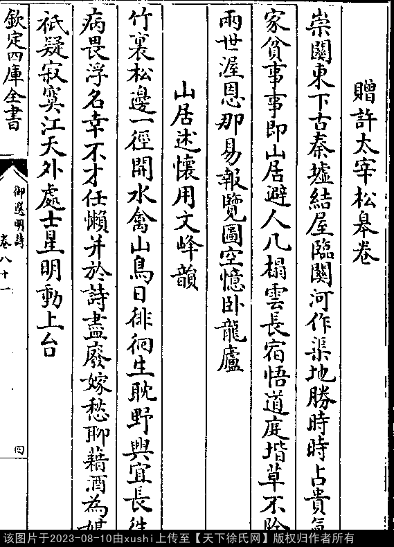 赠许太宰松皋卷 明 · 徐阶 七言律诗 押鱼韵 出处:御选明诗卷八十一 崇关东下古秦墟,结屋临关河作渠。 地胜时时占贵气,家贫事事即山居。 避人几榻云长宿,悟道庭阶草不除。 两世渥恩那易报,览图空忆卧龙庐。 出处: 《御選宋金元明四朝詩-清-聖祖玄燁》御選宋金元明四朝詩 御選明詩卷八十一(第 4a - 4b 頁)